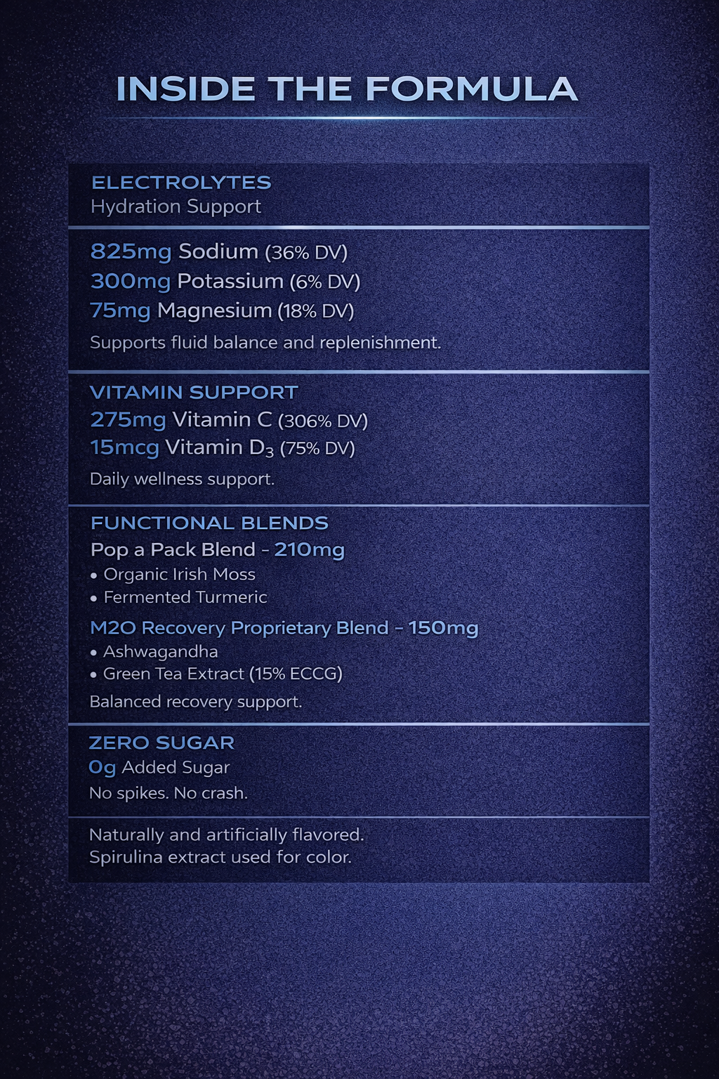 We use premium hydration ingredients, functional vitamins, and performance-focused blends designed for real life, workouts, travel, long shifts, and late nights. You're getting more than just sodium and sugar, you're getting a full hydration system.